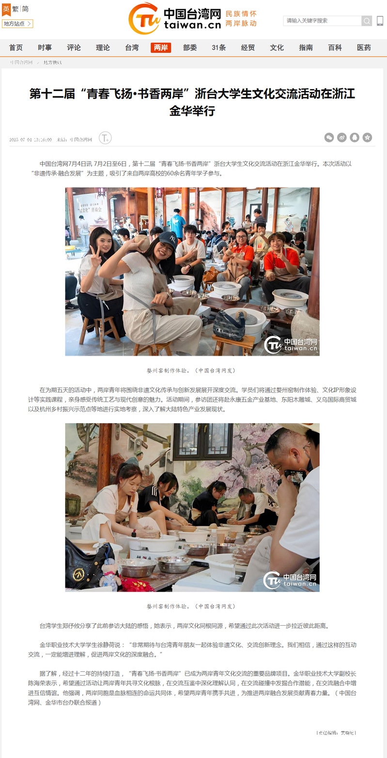 中国台湾网:第十二届“青春飞扬·书香两岸”浙台大学生文化交流活动在浙江金华举行