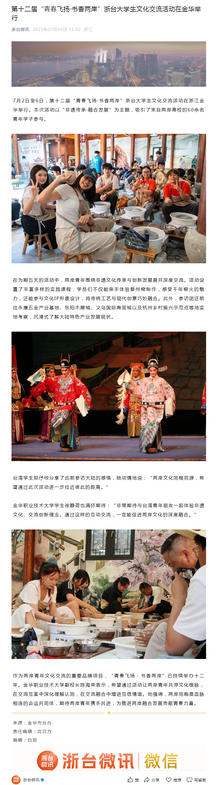 浙台微讯:第十二届“青春飞扬·书香两岸”浙台大学生文化交流活动在金华举行