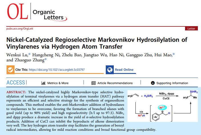 近日,制药工程学院/金华市药物绿色创制技术重点实验室鹿文魁博士以第一作者在国际有机化学权威期刊《Organic Letters》(中科院1区TOP)上发表高水平研究论文,题目为:Nickel-Catalyzed Regioselective Markovnikov Hydrosilylation of Vinylarenes via Hydrogen Atom Transfer。金华职业技术大学为第一通讯单位,制药工程学院毛辉教授、鹿文魁博士以及上海交通大学张兆国教授为共同通讯作者。