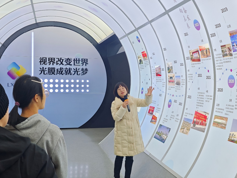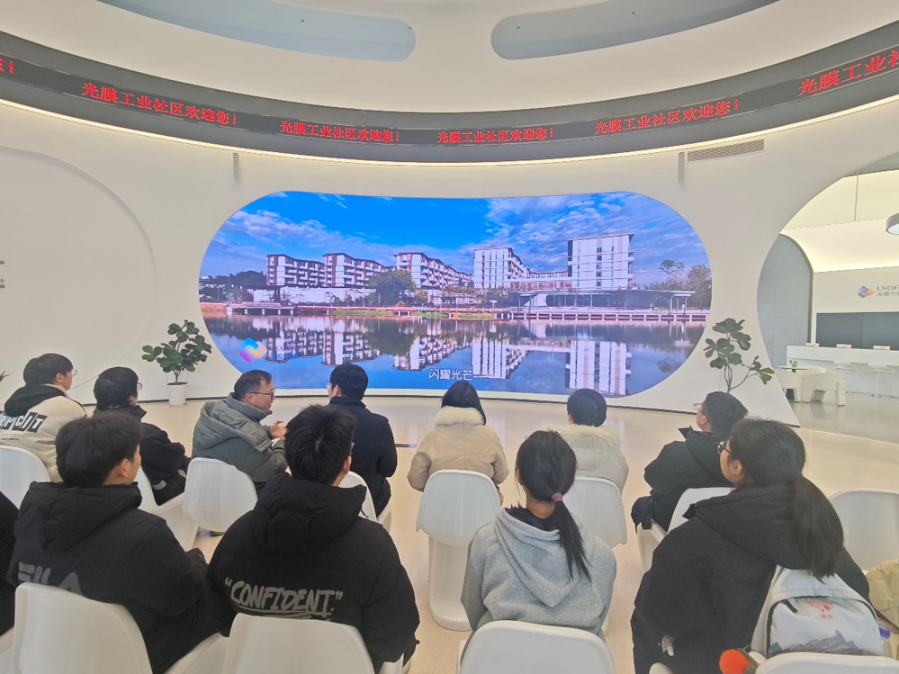 师生首站抵达兰溪光膜小镇客厅,在展厅负责人的引导下,系统了解了光膜小镇的发展历程、产业规划与集群优势。据悉,光膜小镇已吸引一批高新技术企业入驻,形成覆盖光学膜、显示材料、柔性电子等领域的产业链条,正逐步成为长三角地区具有影响力的新材料产业基地。