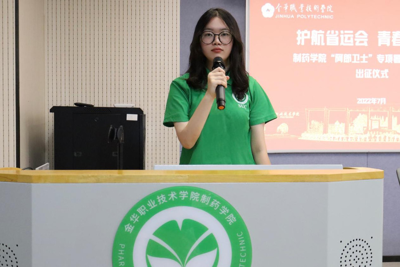 为进一步引导广大学生将课堂所学运用于实践,充分发挥大学生社会实践“第三课堂”的重要作用,7月9日上午,制药学院举行“护航省运会 青春勇担当”——制药学院“阿郎卫士”专项暑期社会实践队出征仪式,金华市食品药品检验检测研究院院长朱中举、制药学院院长金祝年、党委副书记杨卫韵,金华市食品药品检验检测研究院党委委员、食品所所长董晓尉、副所长庄璐出席仪式。