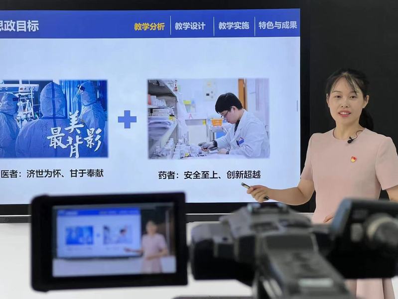 本次比赛历时三个月,分成网络评审和现场决赛两个阶段。其中,网络评审提交材料包括课程思政课堂教学视频、申报书、教学案例、课程教学大纲等。现场评审环节根据教师10分钟说课进行评分,包括课程分析、课程思政整体教学设计、课程思政教学实施以及特色成果等。胡亦沁老师展示的课程为《药学服务实务》,在线上决赛中,其凭借扎实的知识储备发挥出色,教学设计思路清晰、阐述得当,融入方式水到渠成,得到线上评委一致好评,最后以总分第二崭获特等奖,充分展现了我院教师扎实的课程思政能力和良好的职业素养。