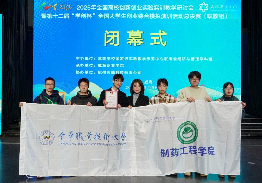 我校参赛队伍由制药工程学院凌杰、杜静雅老师指导,夏省伟、朱宸熙、应涛聪、叶晓杰四名同学组成。备赛时,团队紧扣专业特色调研市场、打磨方案、高频推演,凭专业知识、市场判断与协作,从校赛、省赛、全国半决赛一路突围,晋级全国总决赛。总决赛中,代表队沉着应战:模拟赛道上,精准研判市场趋势、科学配置生产、营销、财务资源,以稳定运营获一等奖;在计划书答辩环节,凭借清晰逻辑、生动展示及核心技术与商业模式解读,以全场最高分摘得金奖。
