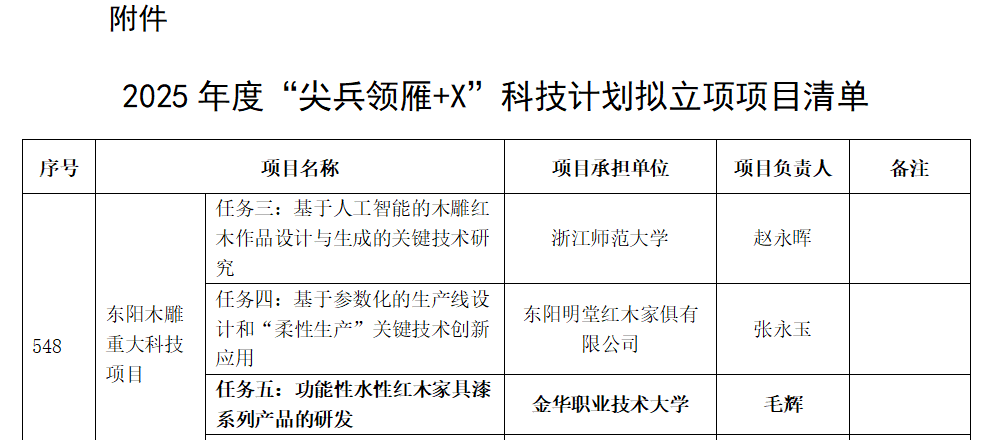 近日,浙江省科学技术厅公布2025年度“尖兵领雁+X”科技计划项目,学院毛辉教授申报的《功能性水性红木家具漆系列产品的开发》项目成功入选,这是我校首次主持立项该项目,标志着学校在重大项目攻关方面迈出了重要的一步。 ![]() ![]() “尖兵领雁+X”研发攻关计划由省级财政资金设立,围绕建设“互联网+”、生命健康和新材料三大科创高地和抢占“碳达峰、碳中和”技术制高点,聚焦十大标志性产业链、未来产业等重点领域,兼顾社会公益等重大技术需求,在全省范围内公开征集榜单,是浙江省为突破关键核心技术、推动经济社会高质量发展而设立的重大科技专项。立项后,可获得最高1000万元的省科技专项资金补助。《功能性水性红木家具漆系列产品的开发》项目紧紧围绕我省重大战略建设需求以及“315”科技创新体系和“415X”先进制造业集群发展要求,开发具有耐污、防霉、抗菌等功能多样性的水性红木家具漆,支撑金华木雕历史经典产业高质量发展。 学校及学院高度重视科研项目申报和科技创新类人才梯队培养,通过构建科研平台、引进高水平人才、优化科研机制、加强校企合作以及推动科研成果转化等多种措施,有效推动科研工作,为地方经济社会发展作出重要贡献。接下来,学院将进一步推动高水平项目的培育和申报工作,努力提升高水平代表性科研项目的数量,推动学校在科技创新和产业升级领域研究再上新台阶。